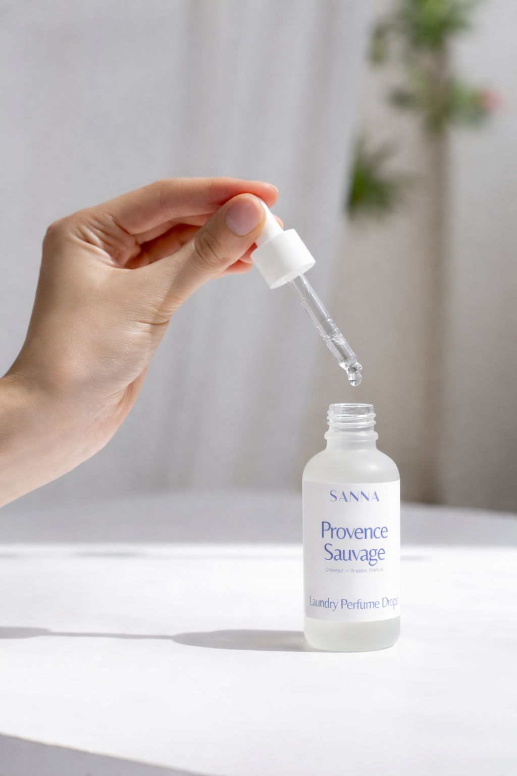 SANNA laundry perfume is a perfumer-crafted fine fragrance, added at the final step of laundry to scent fabrics without coating them.